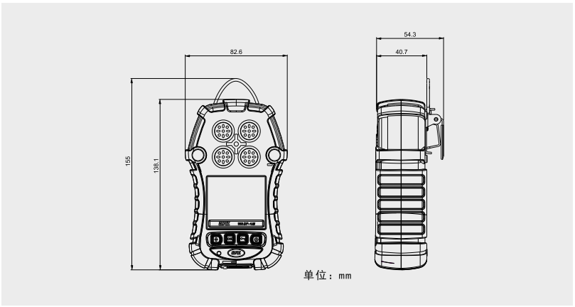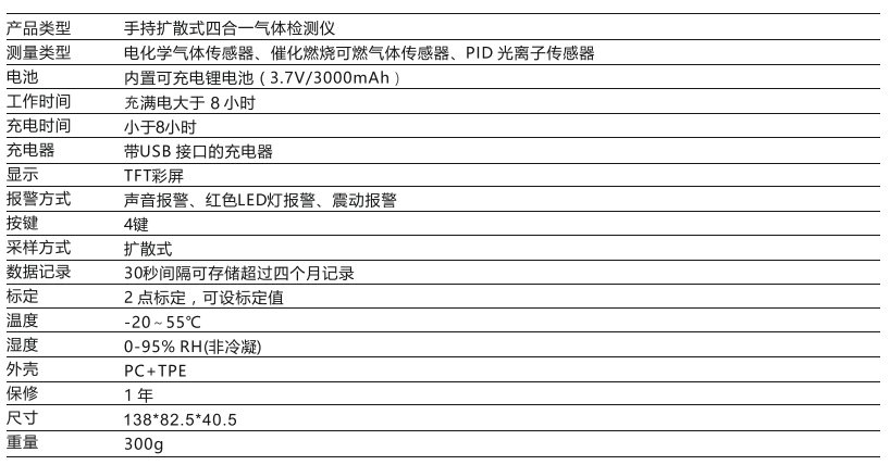 2.31”TFT 液晶彩屏顯示、圖形菜單、中英文顯示,開機提示距傳感標定時間和更換時間,USB可充電鯉電池,使用時間大于8個小時,內置數據存儲,可以存達兩個月數據,智能型結構模塊化、維護簡單,具有聲、光、震動報警功能。