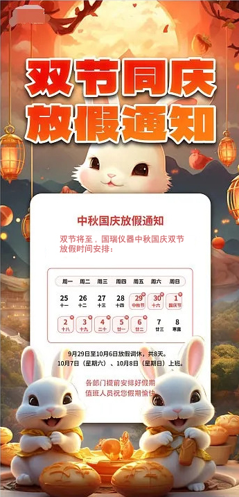 根據《國務院辦公廳發布關于 2023 年部分節假日安排的通知》,現將國瑞儀器2023年中秋國慶假日安排通知如下: